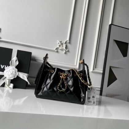 Quilted calfskin! Adjustable metal Double C clasp. Finished hand handle with edge paint, drawstring closure featuring a secure inner pocket.