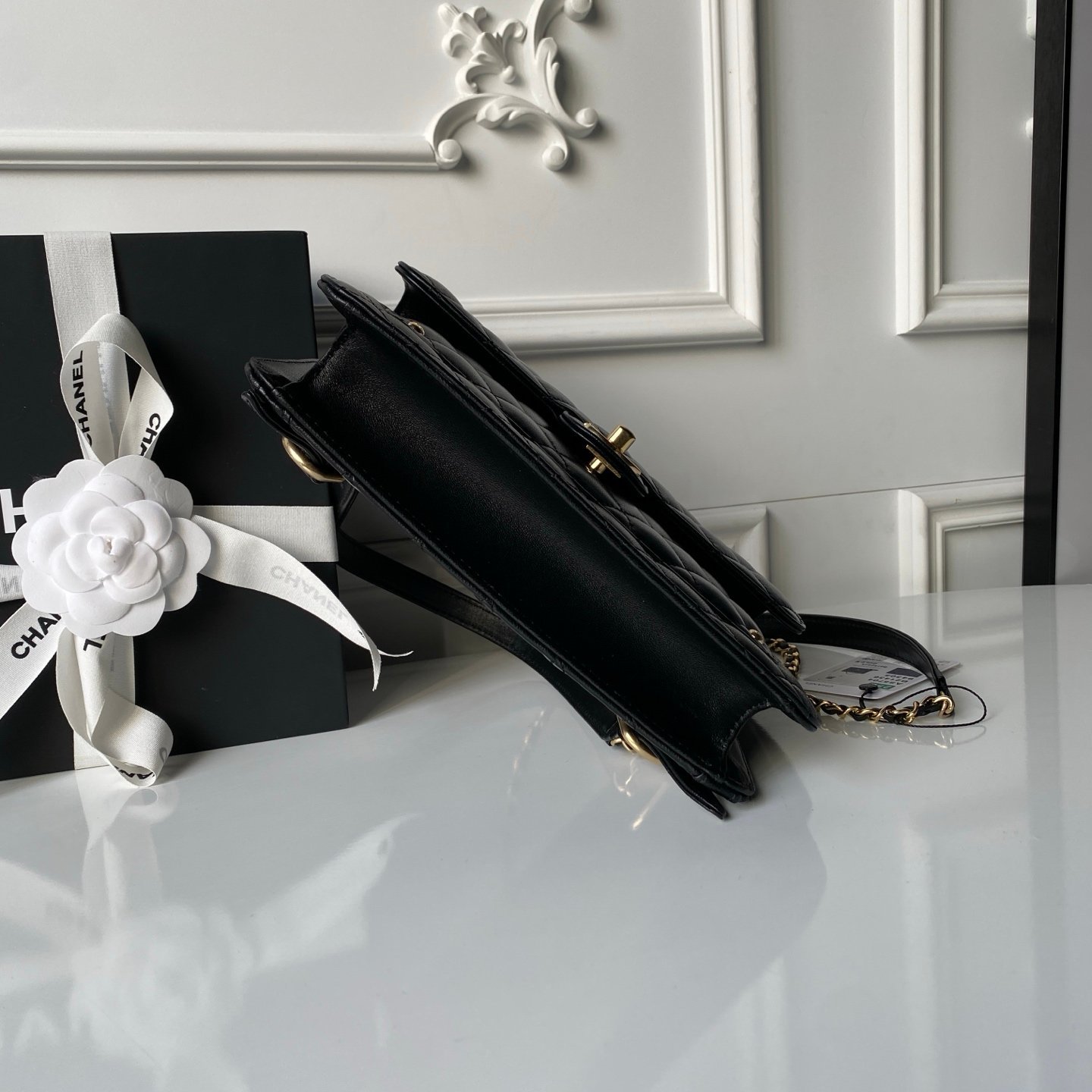 Adopts the iconic Double C logo design. The strap is crafted with a combination of metal chain and lambskin, delivering an enhanced vintage texture.
