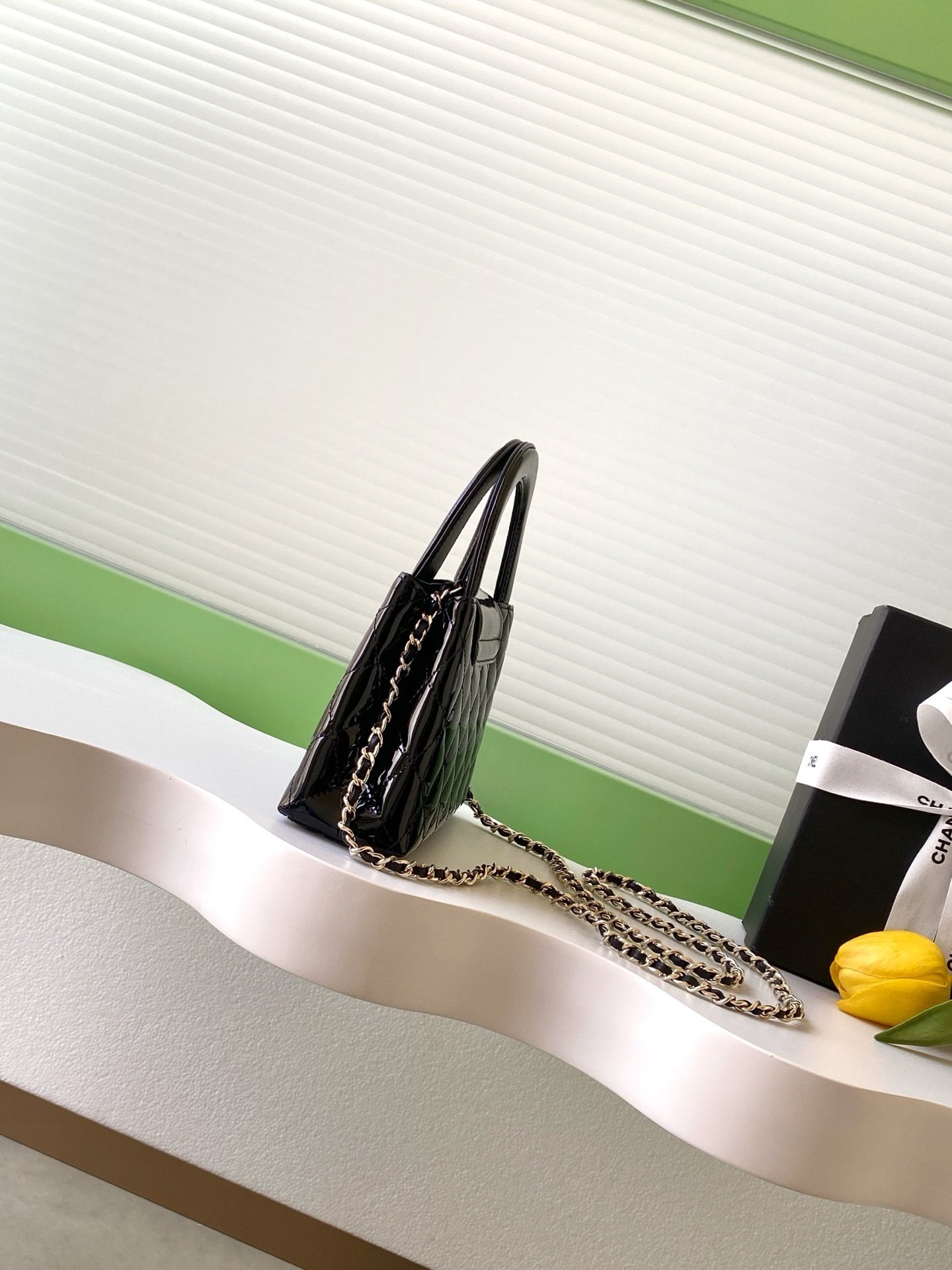 26C Kelly Chain Bag, black patent leather with classic diamond quilting, super glossy metallic finish!