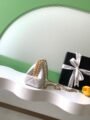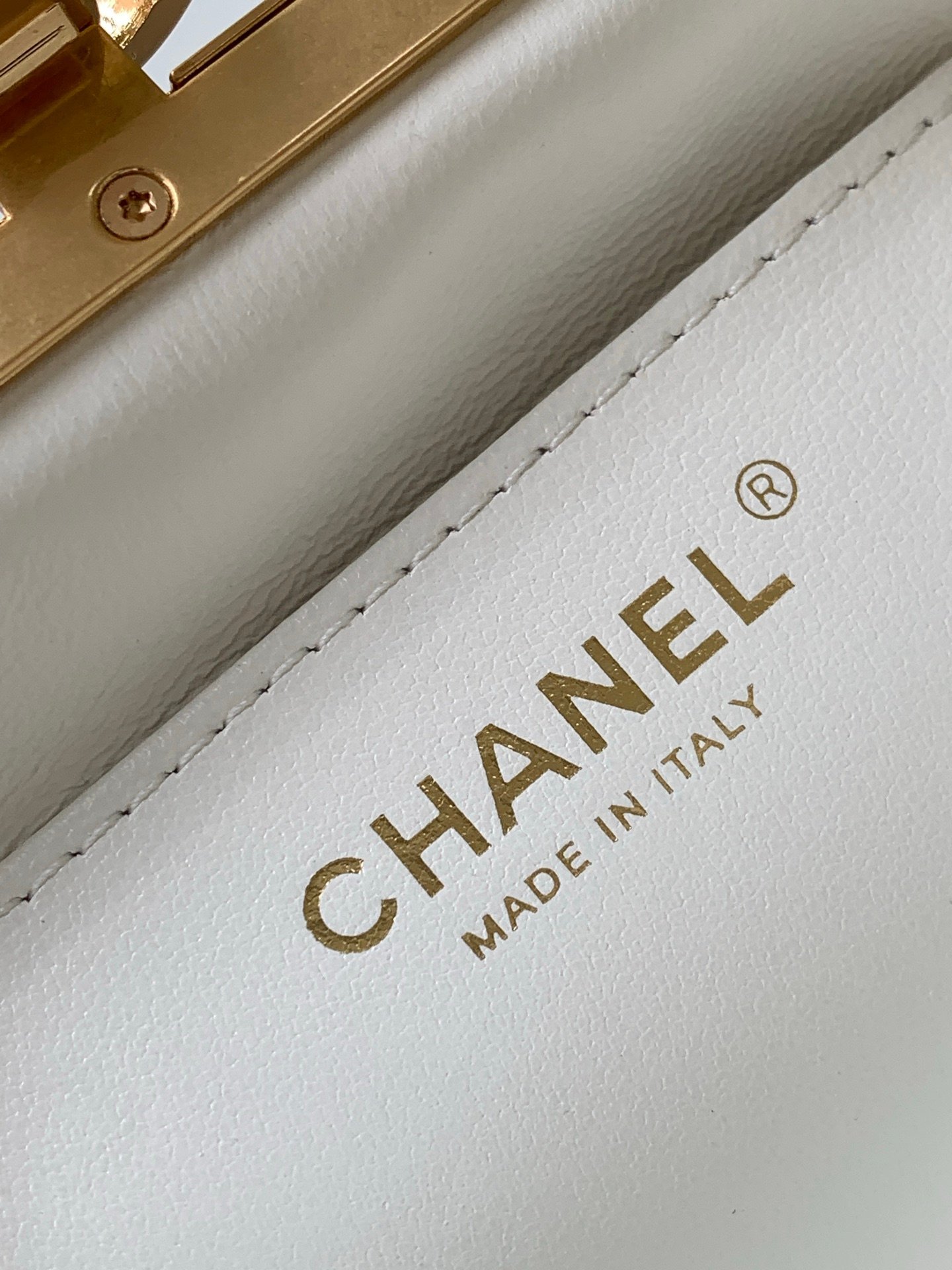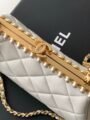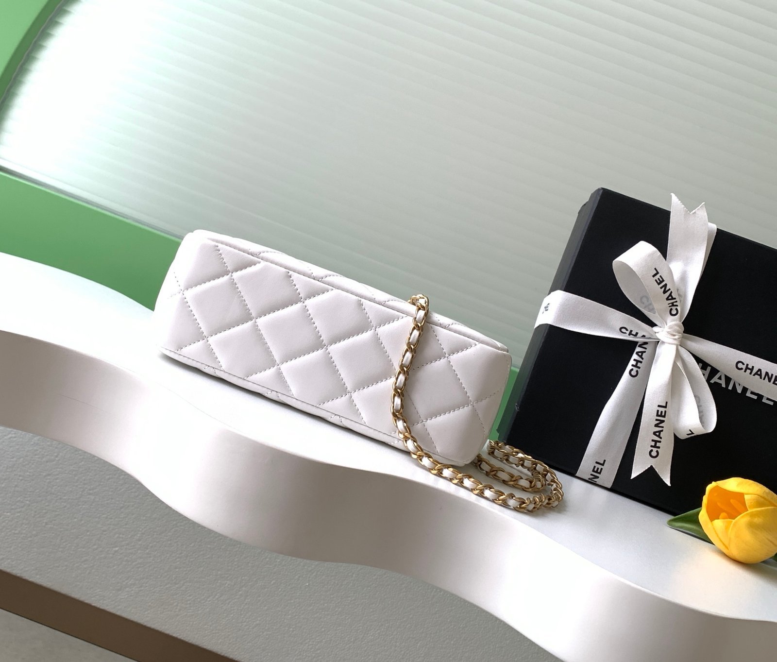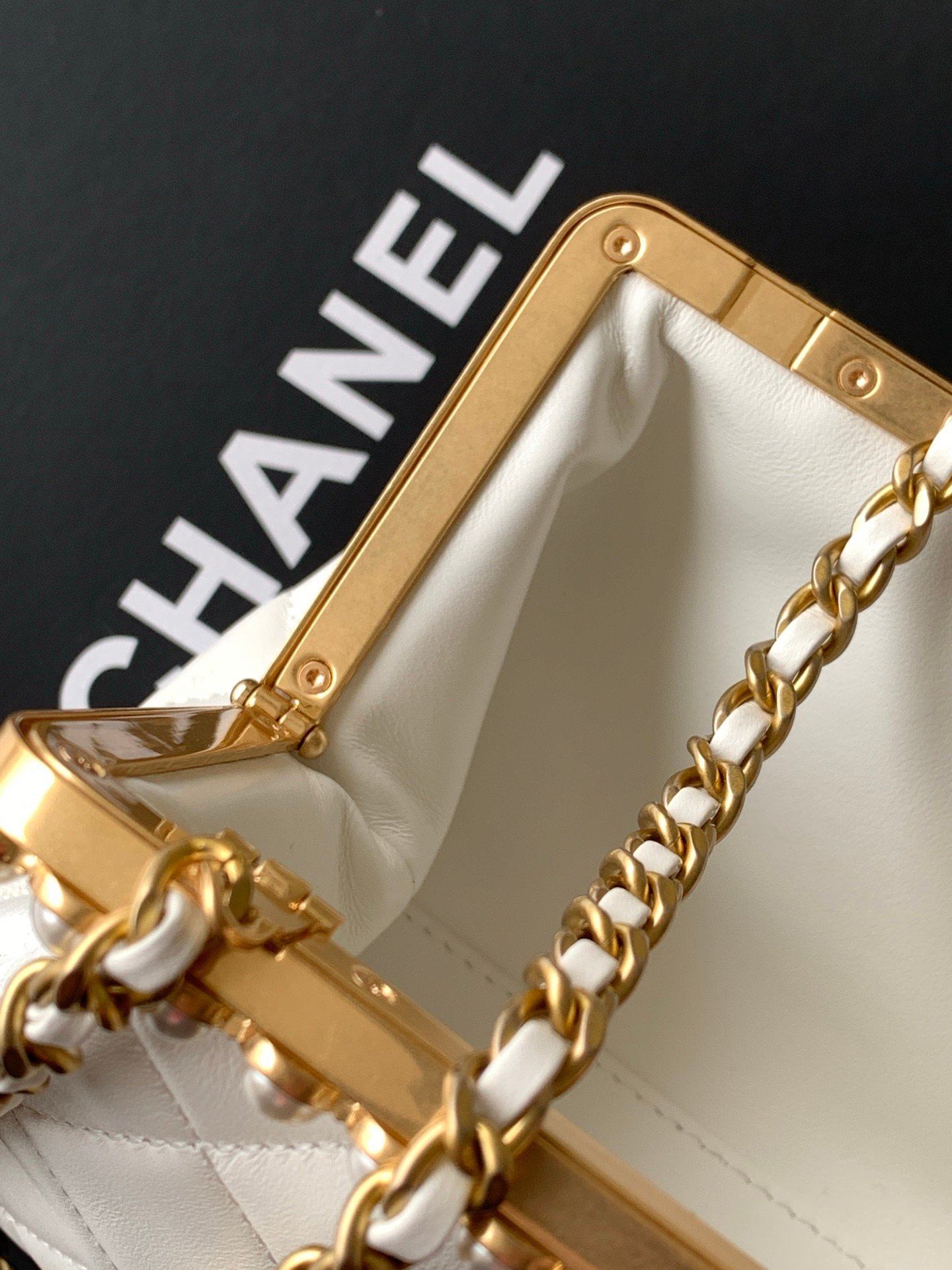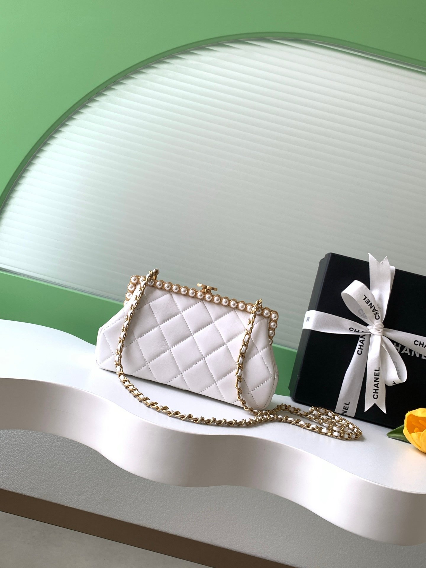 White quilted lambskin with pearl chain, full of elegant vintage charm.