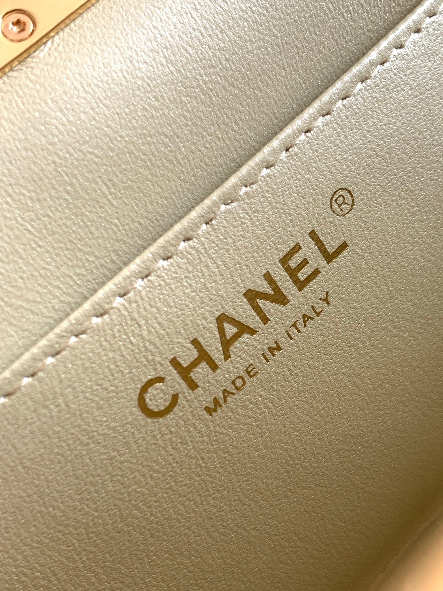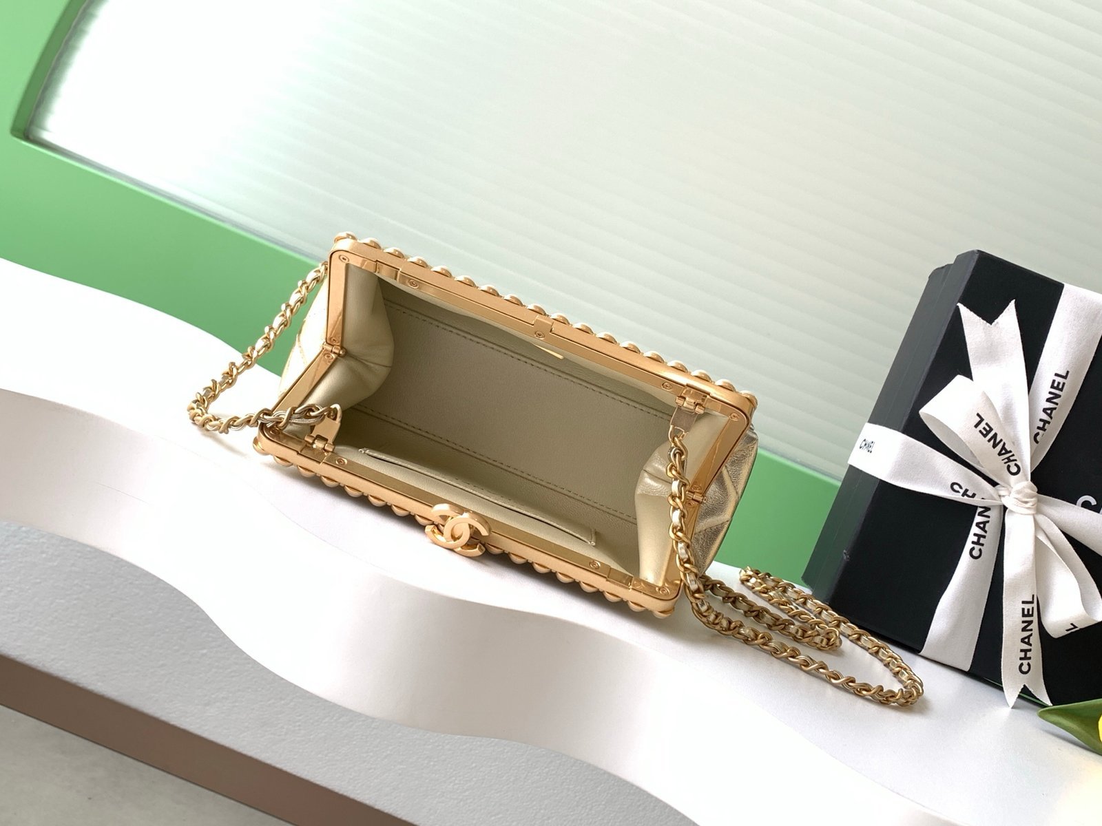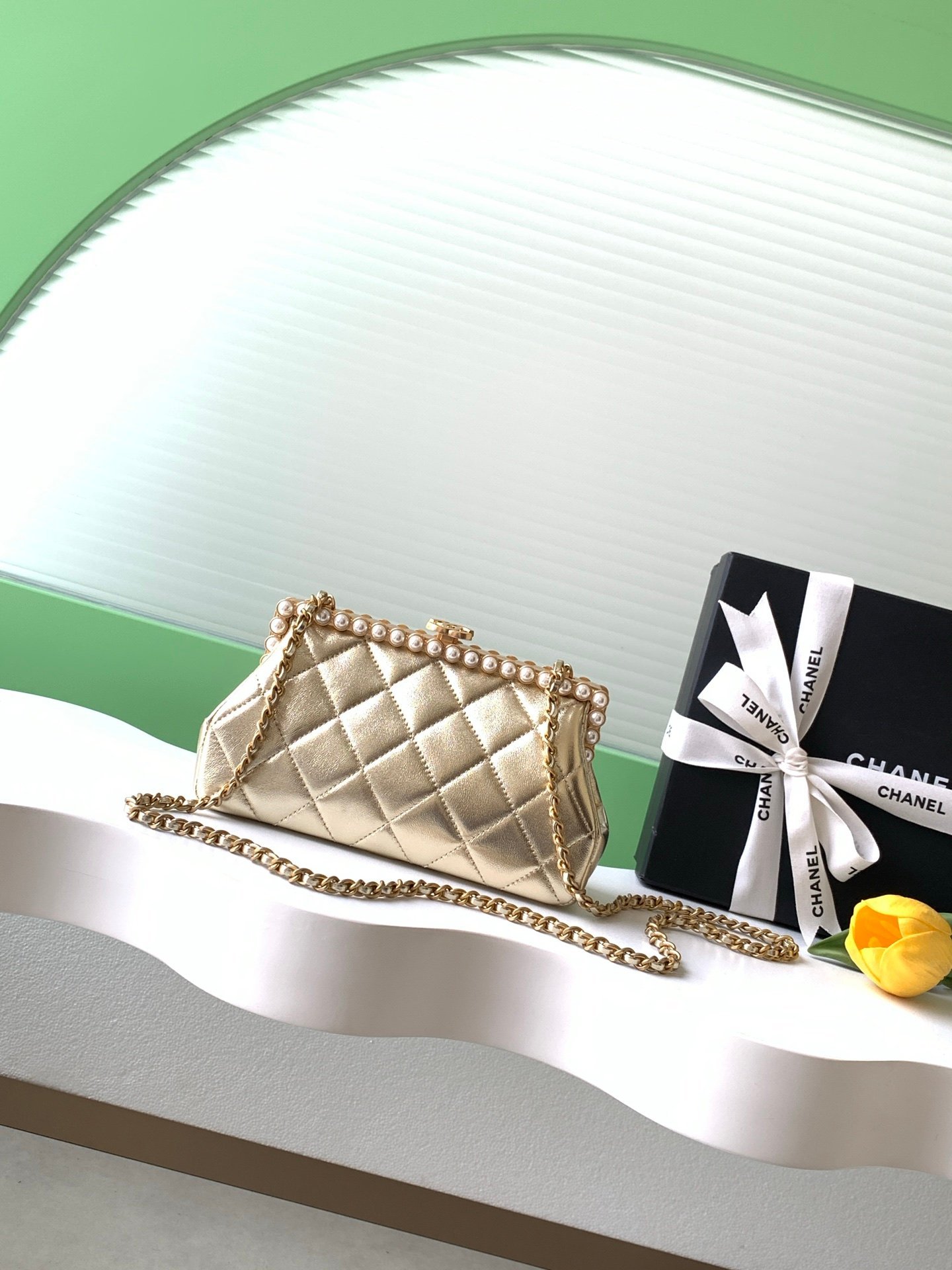 Gold quilted lambskin with pearl chain, full of elegant vintage charm ✨.