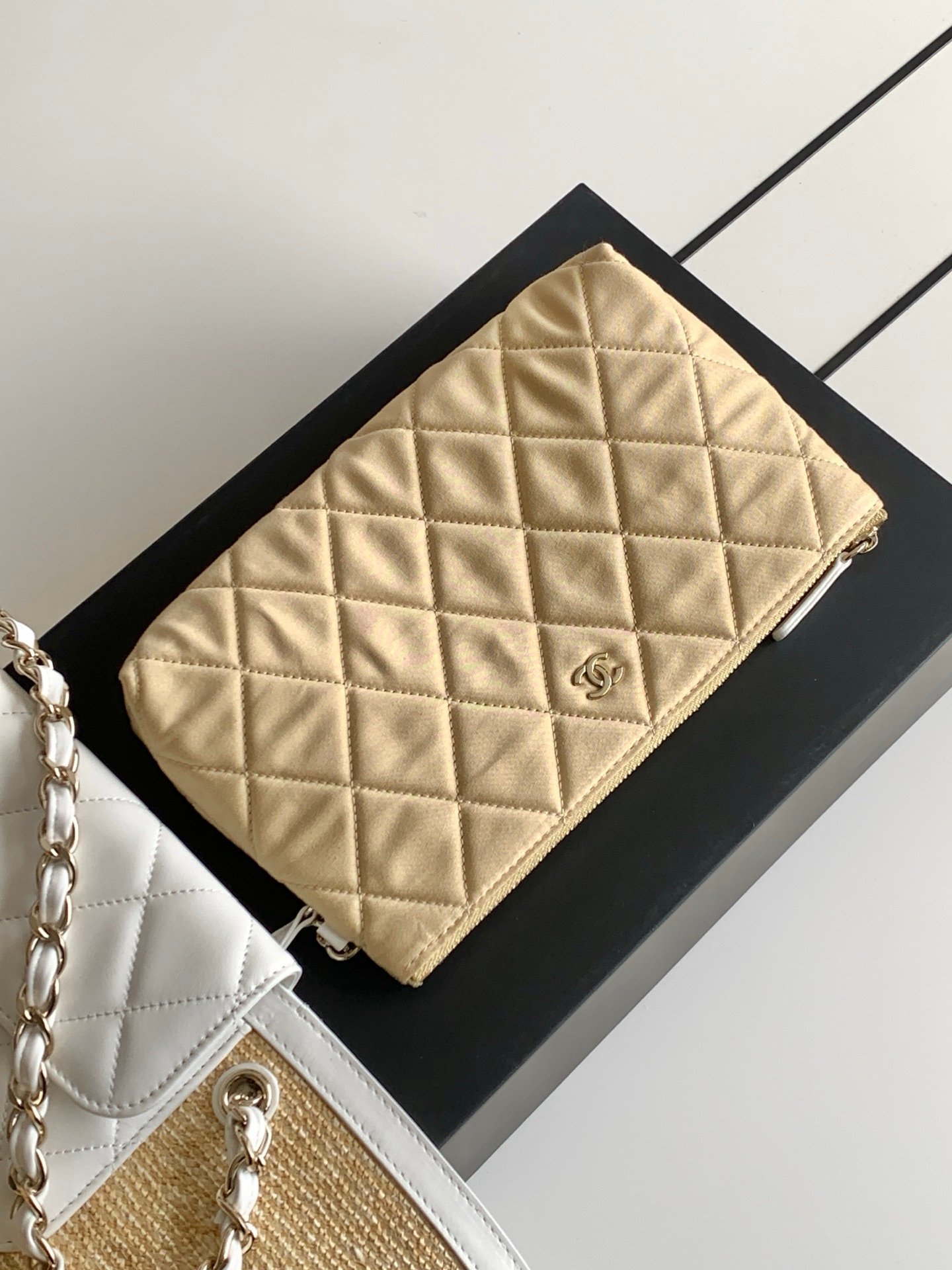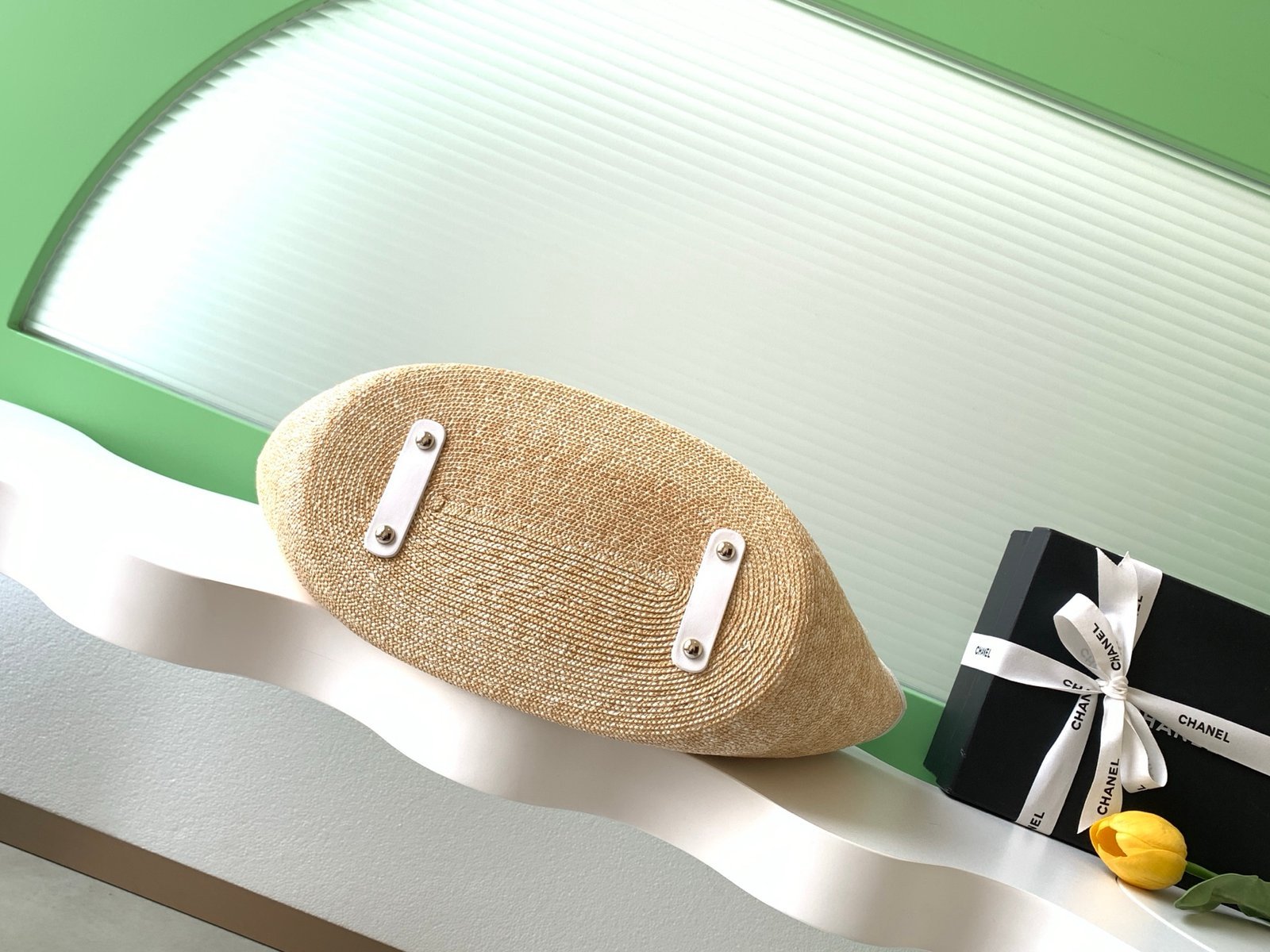 Crafted from natural raffia & white leather paneling, paired with iconic quilted pattern and metallic chain. Signature Double C logo ensures instant luxury recognition.