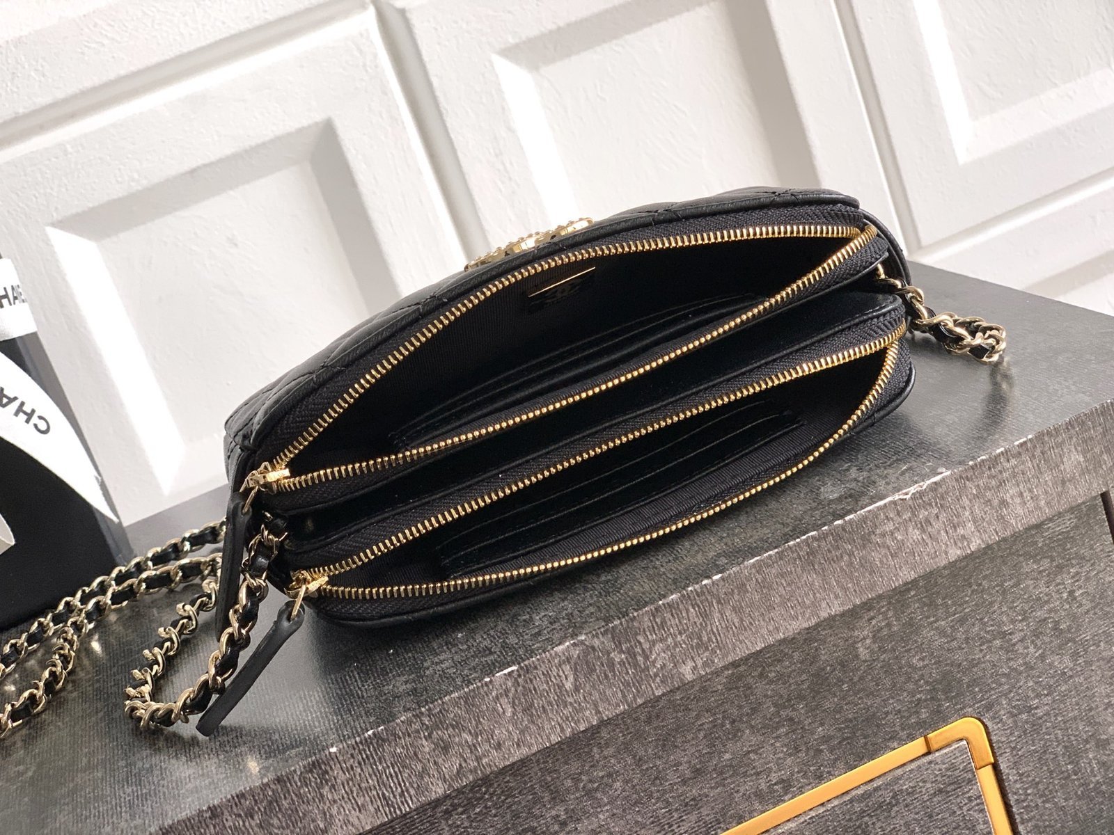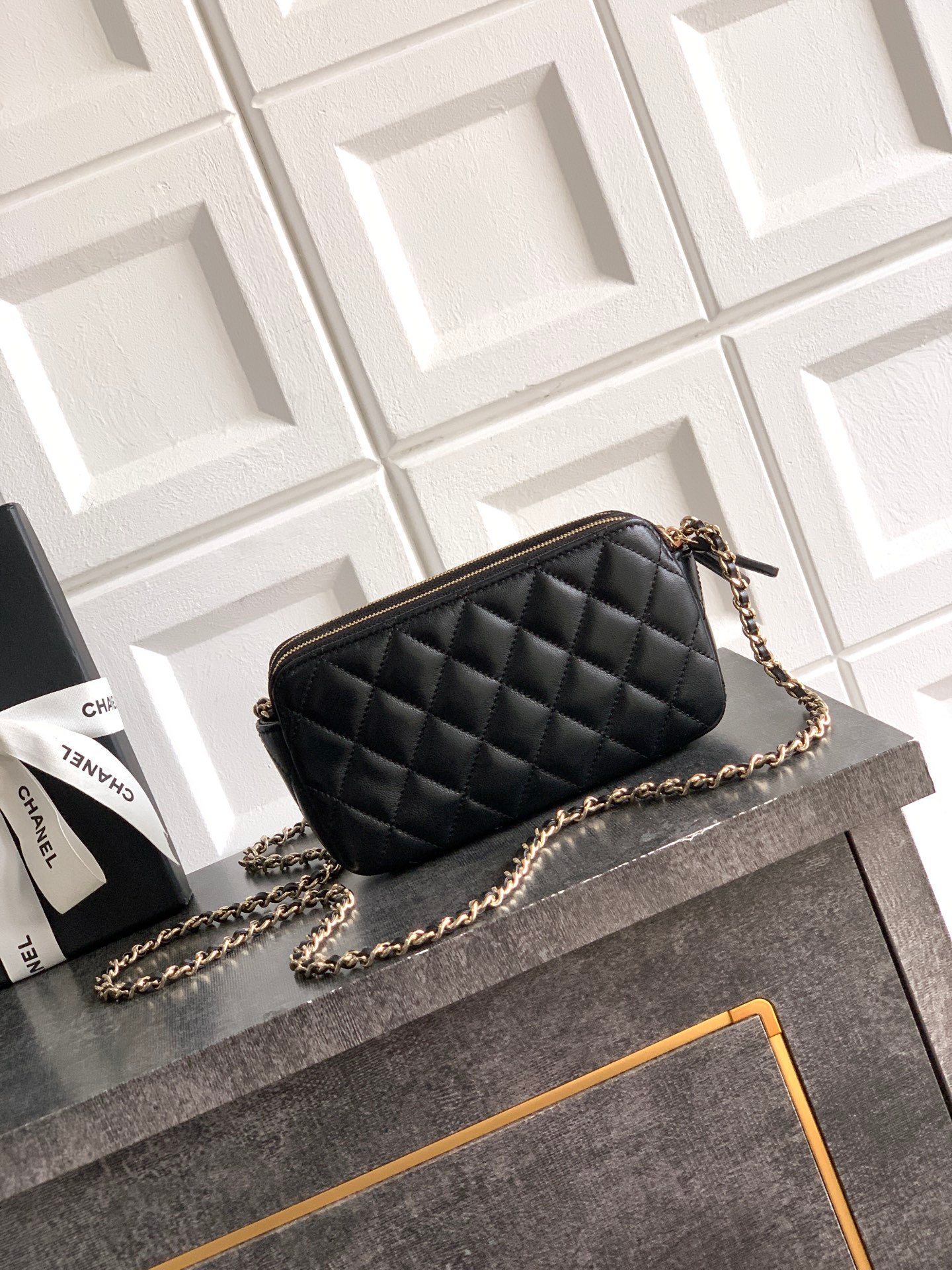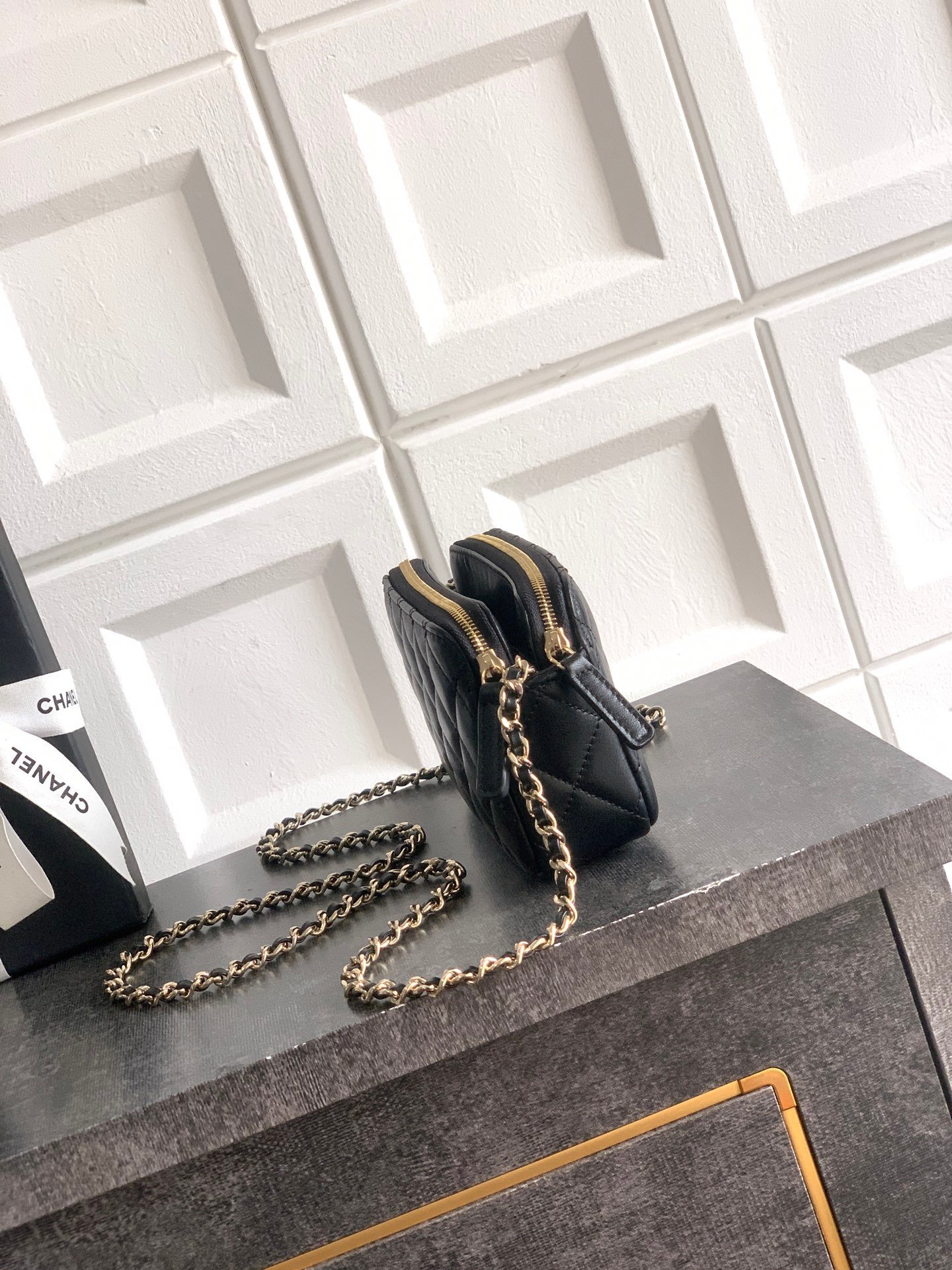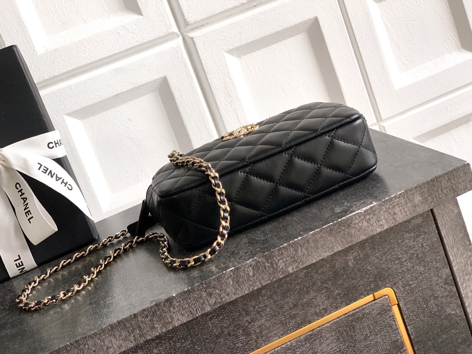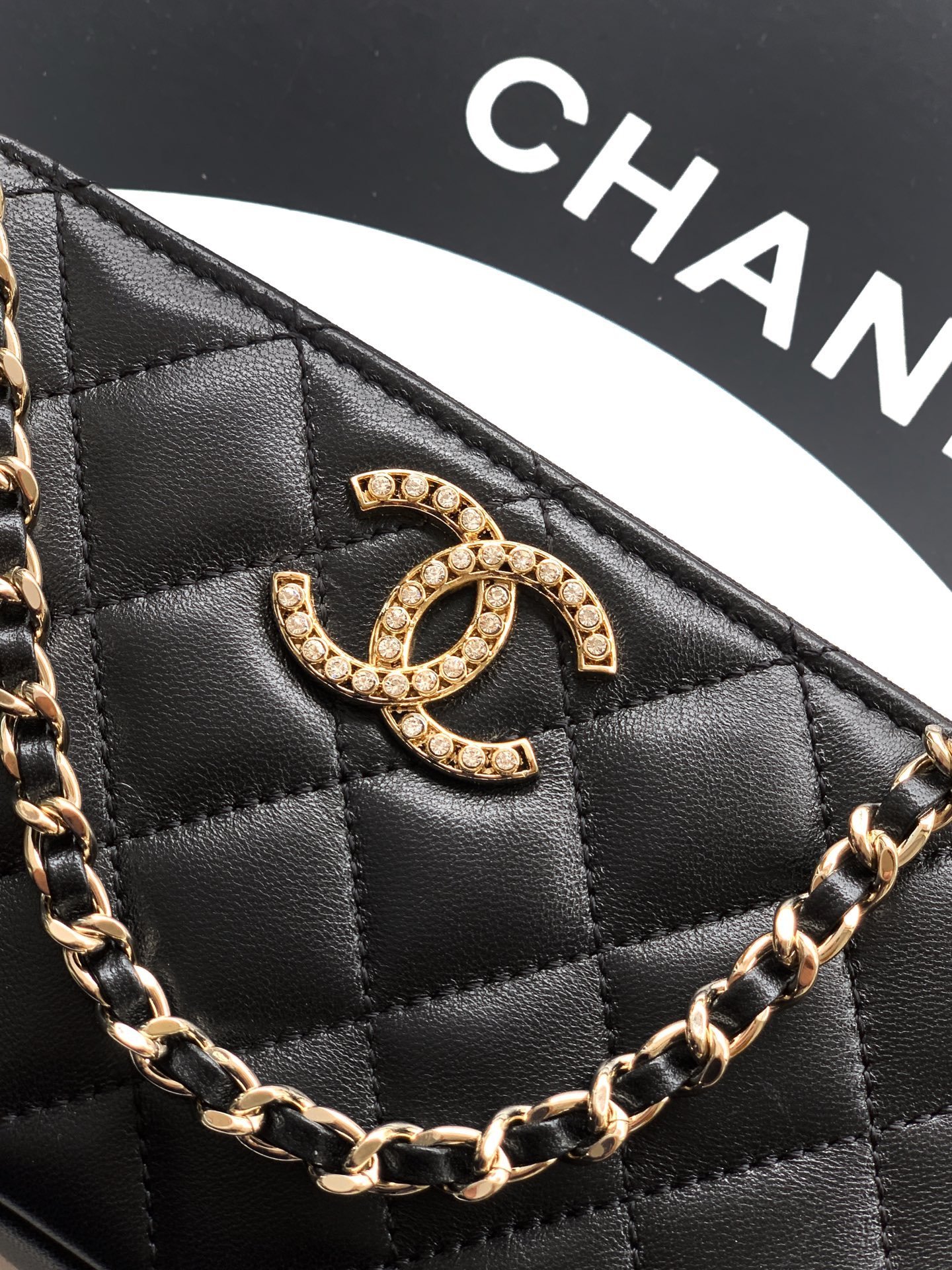 Black Lambskin | 25K Crystal Chain Phone Bag