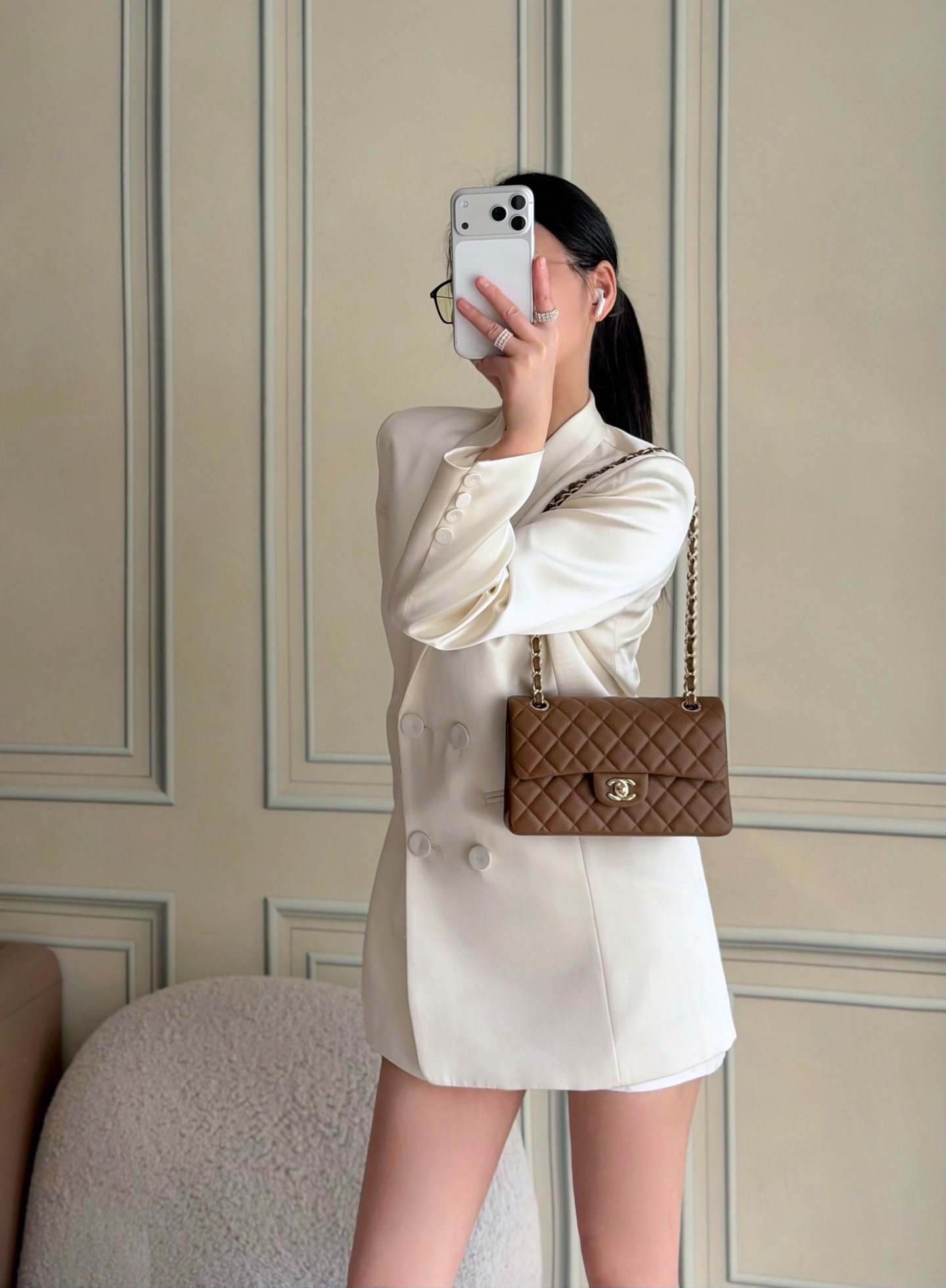 Pure white radiates gentle, refined grace, paired with a gold buckle for delicate luxury.